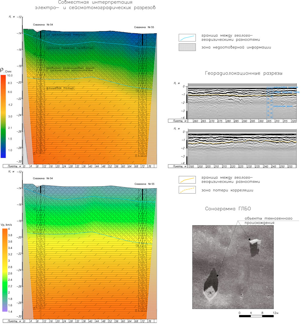Основная цель работ состояла в определении глубины залегания кровли флишевой толщи и характера напластования грунтов на акватории, отличающихся своими петрофизическими свойствами, а также исследование тела пирса с целью определения степени его однородности. Для достижения поставленной цели были выполнены комплексные геофизические исследования, включающие в себя сейсморазведочные, электроразведочные работы, гидролокацию бокового обзора на акватории, а также георадиолокационные наблюдения на поверхности пирса. В результате обработки полученных материалов построены геолого-геофизические разрезы. Совместная интерпретация геофизических данных и данных бурения позволила уверенно проследить кровлю флишевой толщи, выделить границу текучих грунтов в верхней части разреза, а также выявить нарушения слоистости насыпных грунтов непосредственно в теле пристани. Анализируя полученную мозаику ГЛБО, удалось определить природу техногенных объектов, выявленных на дне акватории.