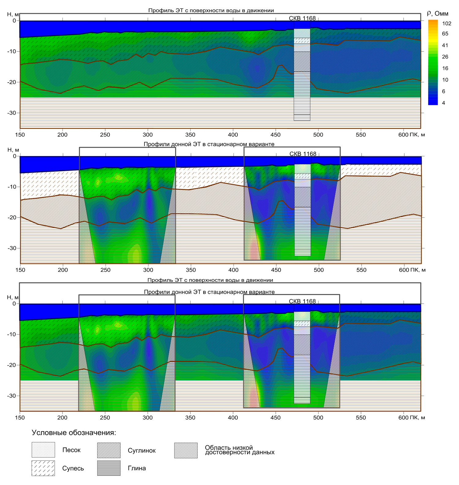 Основная цель работ состояла в получении информации о геологическом строении участка, характере напластования грунтов, их залегания и мощности. Для решения поставленной задачи применялись томографические модификации метода сопротивлений, сочетающие в себе методики профилирования и вертикального электрического зондирования. Основной объем наблюдений выполнен в движении с диполь-дипольной установкой на 8-ми разносах. Для заверки и уточнения результатов выполнена донная электротомография (ЭТ) с использованием трехэлектродной установки в стационарном режиме наблюдения. По результатам работ был уточнен геологический разрез между скважинами и, несмотря на слабую дифференциацию по значениям удельного электрического сопротивления (УЭС), выделены объединенные геолого-геофизические слои: глины в основании разреза, обводненные суглинки в центральной части разреза и у поверхности песчано-супесчаная толща.
